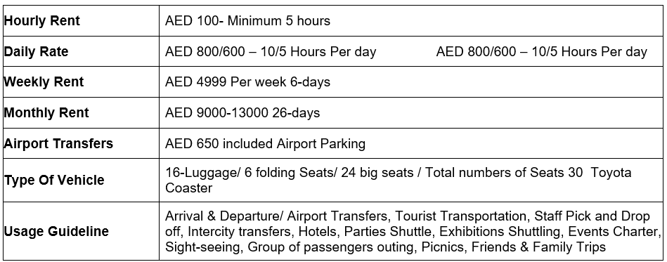 For all your transportation needs, whether it’s minibus rental in Dubai or Toyota Coaster bus rental throughout the UAE—our exceptional fleet and professional services are designed to meet your requirements.